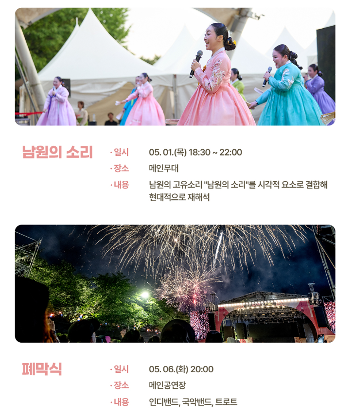 전통의 아름다움, 예술의 정수, 그리고 남원의 따뜻한 환영을 한 자리에서 느끼고 싶다면, 춘향제 대표 행사들을 중심으로 일정을 계획해 보시기 바랍니다.